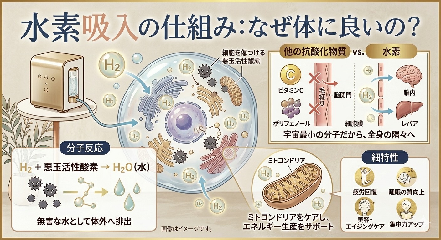 水素は、あらゆる物質の中で非常に小さな分子で体内に取り込まれると全身に広がりやすく、脳や細胞の中まで届くと考えられており、水素吸入することで水素が体内にある悪玉活性酸素とのみ結合し汗や尿として体外に排出させてくれることで美容や健康維持に繋がると考えられています。こうした特徴から、水素は体に良いのではないかと注目されています。